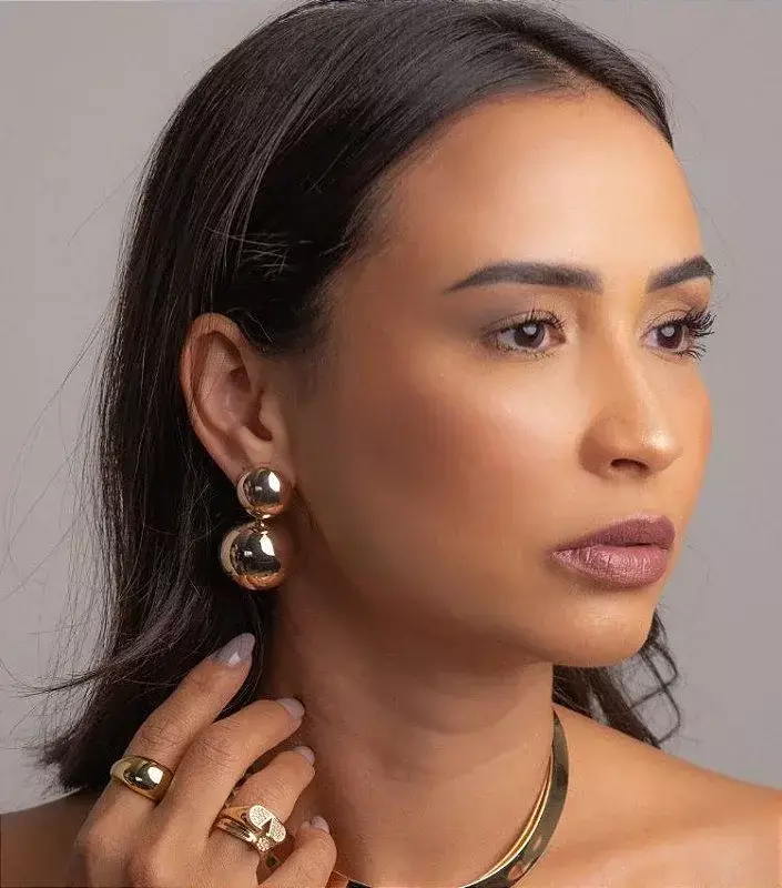 Banho ouro 18k de alta qualidade com tecnologia antialérgica para uso prolongado. Design elegante de esferas duplas, leve e confortável, com pino centralizado que garante encaixe estável. Garantia de 6 meses no banho e contra defeitos de fabricação.